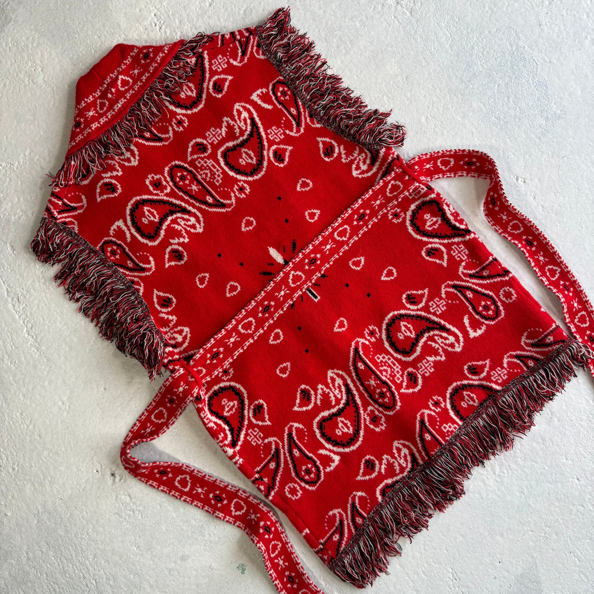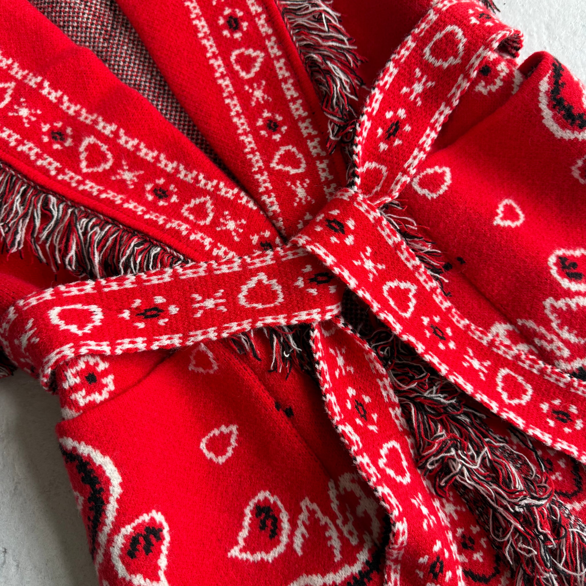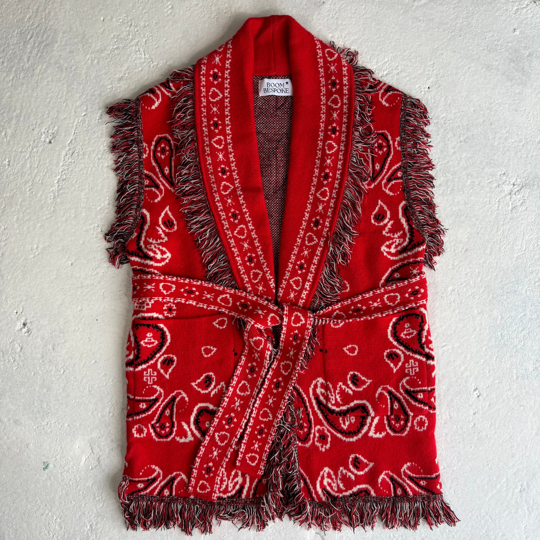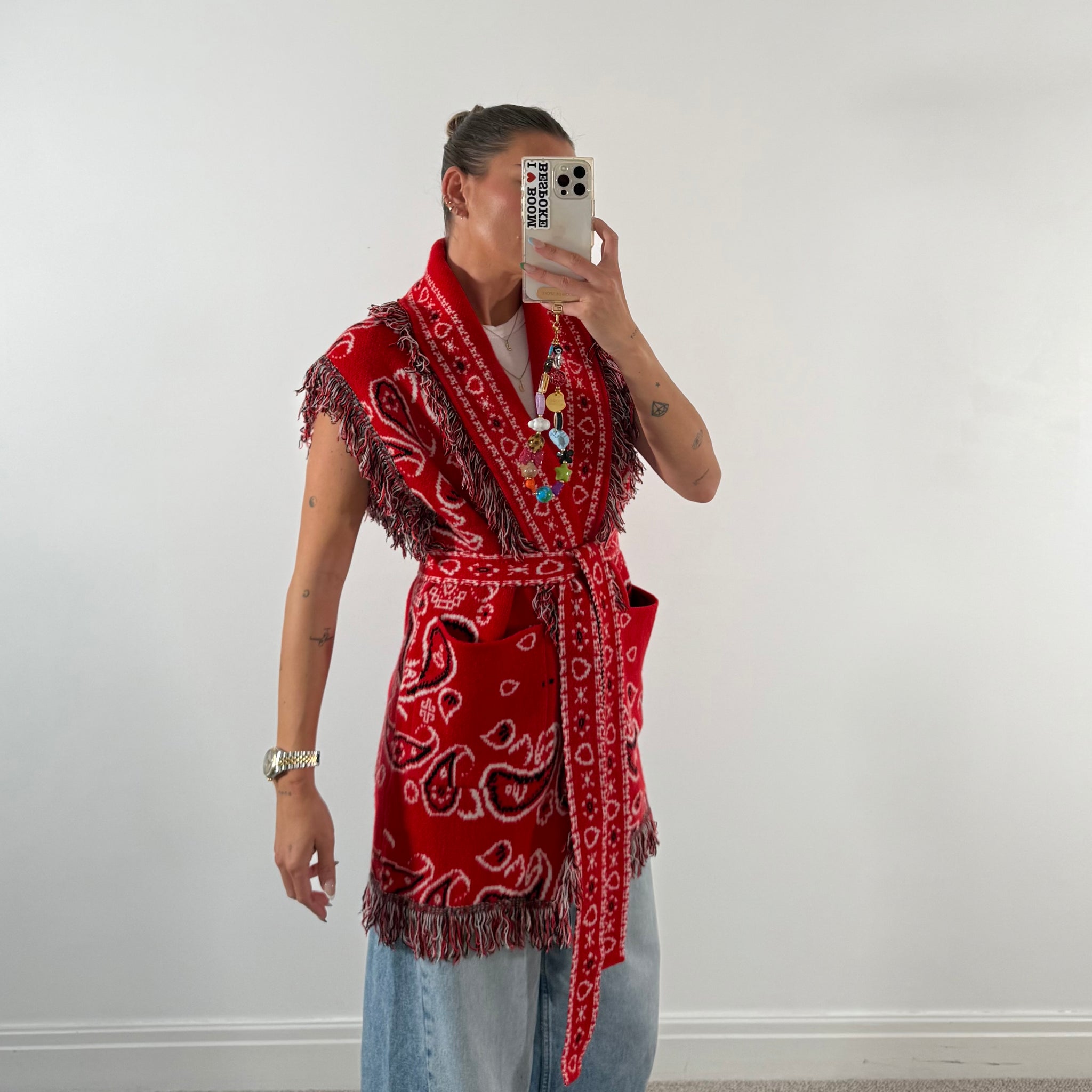 ‘Heart’ fringed bandana knit belted longline sleeveless cardigan with a red base, off white & black paisley bandana pattern