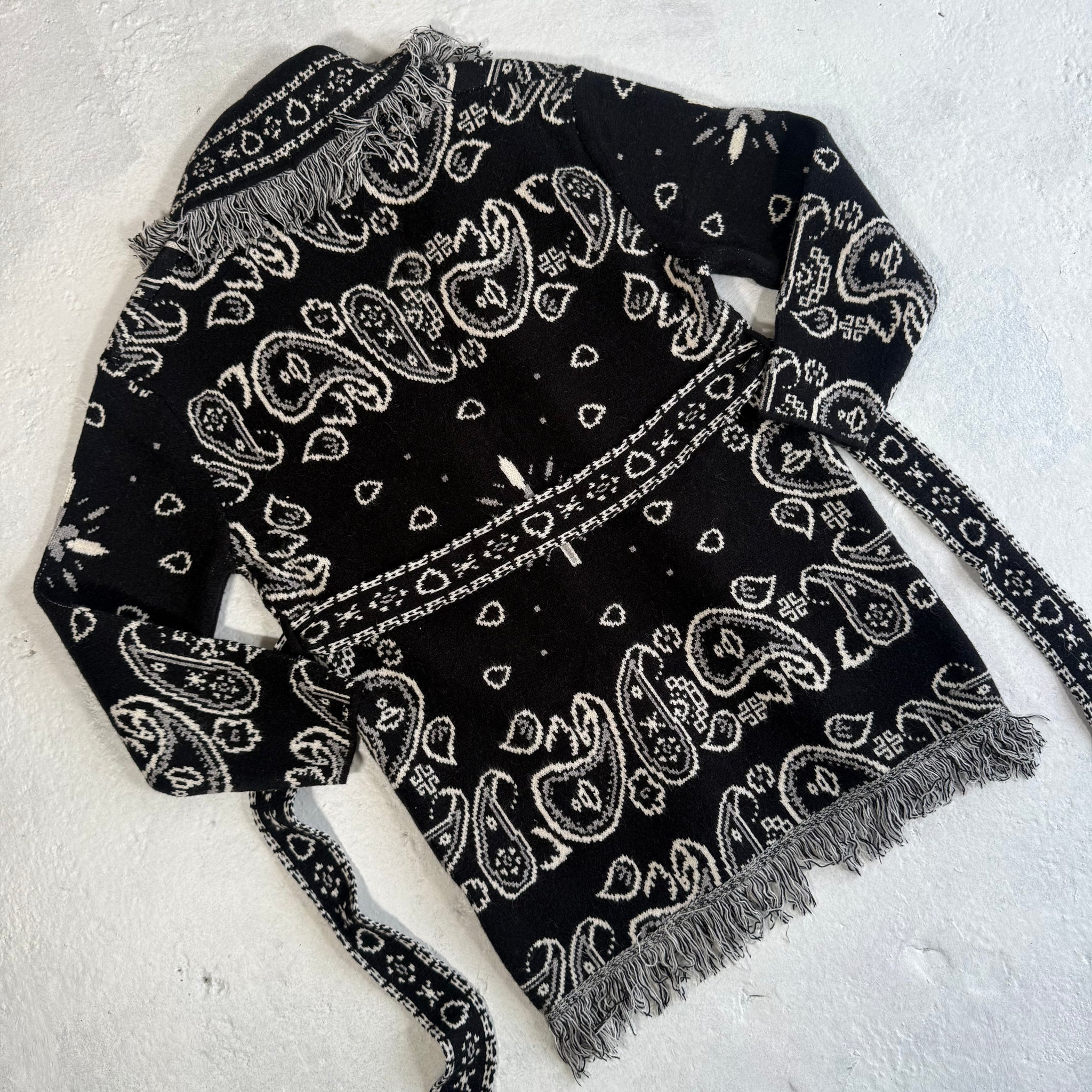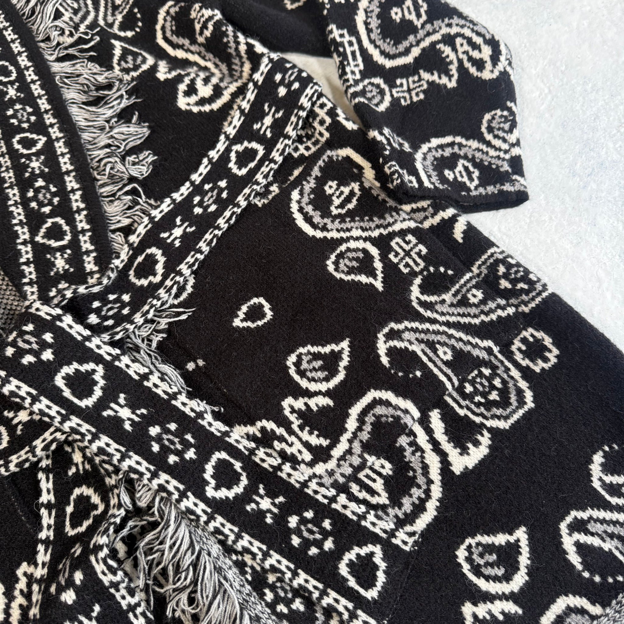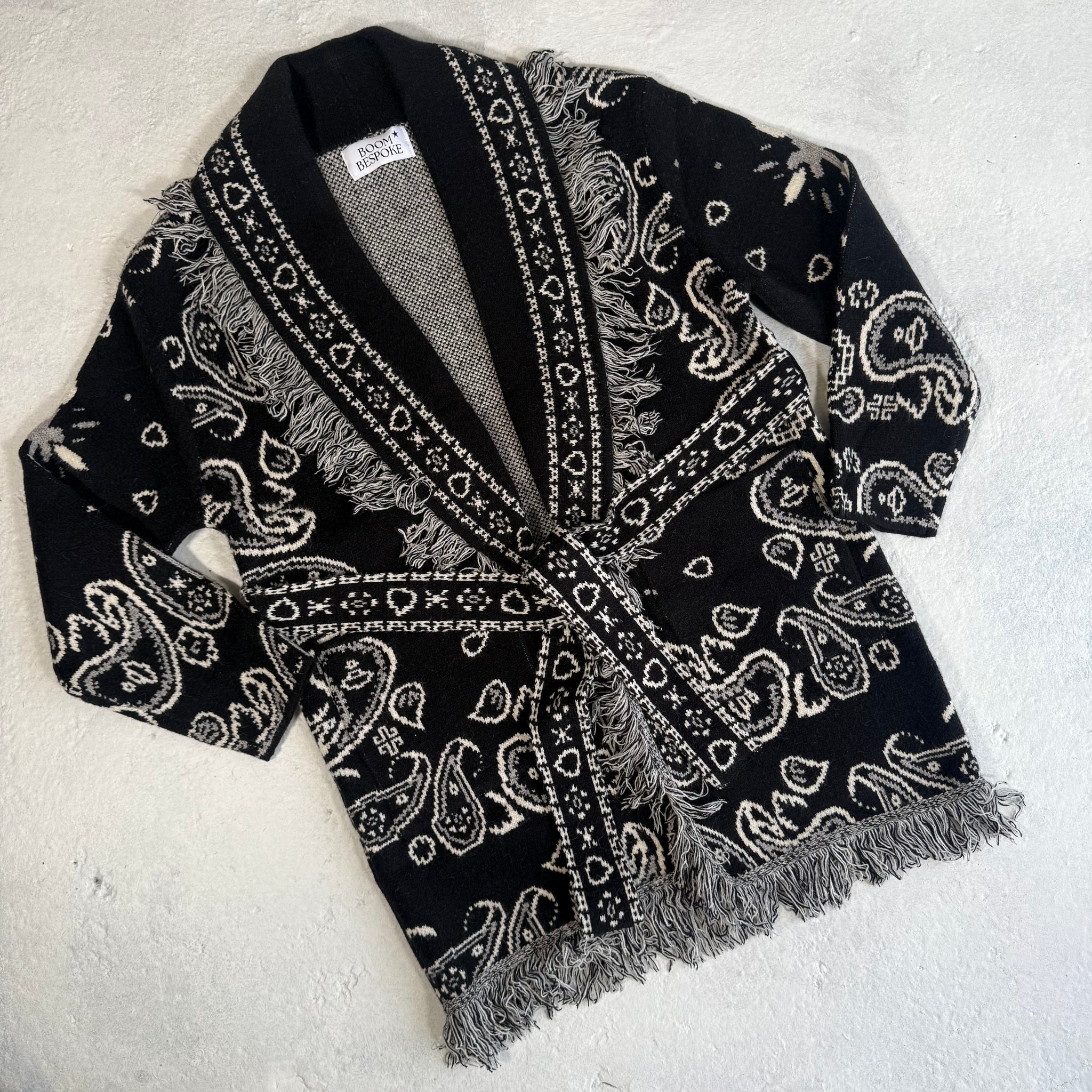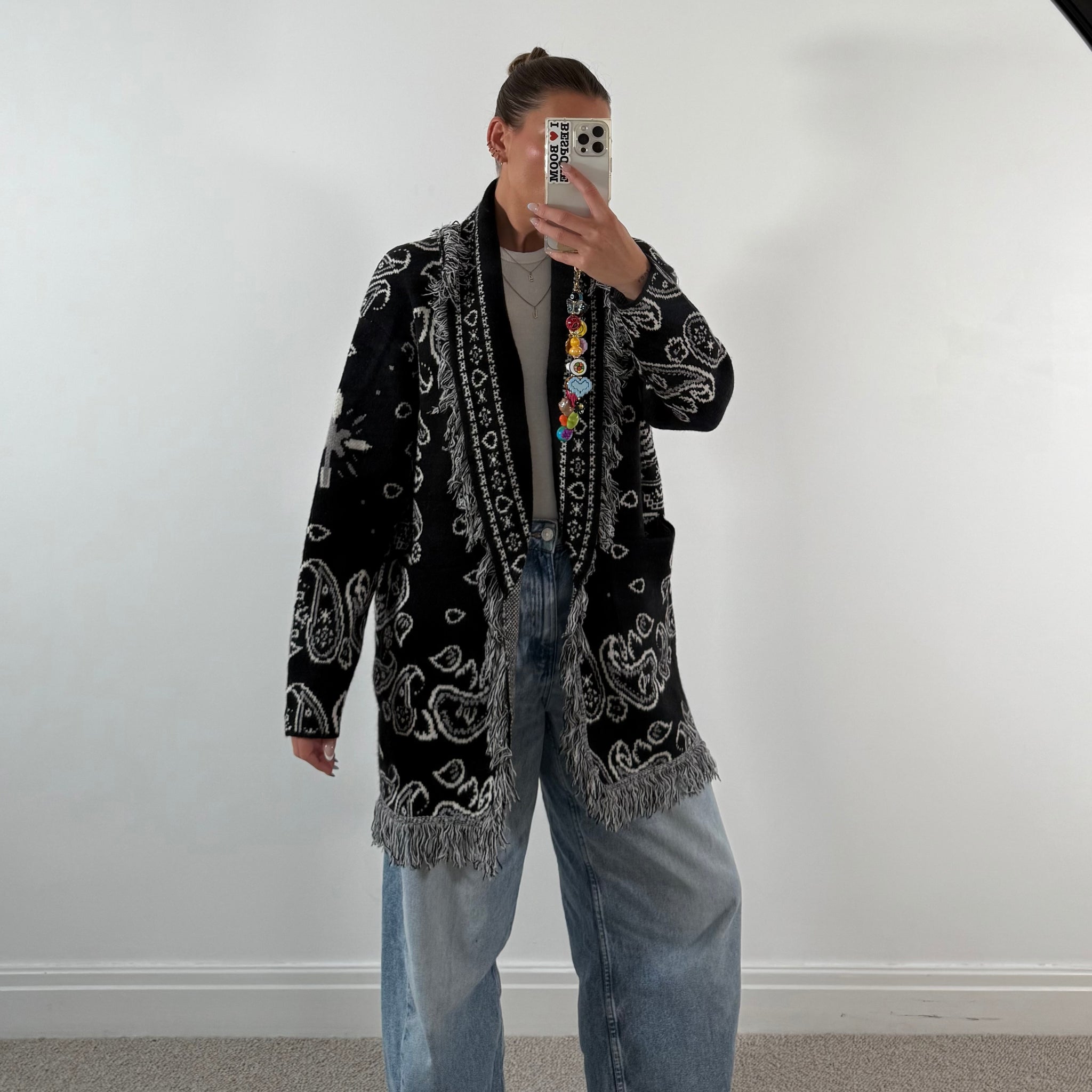 ‘Inked’ fringed bandana knit belted longline cardigan with a black base, off white & grey paisley bandana pattern