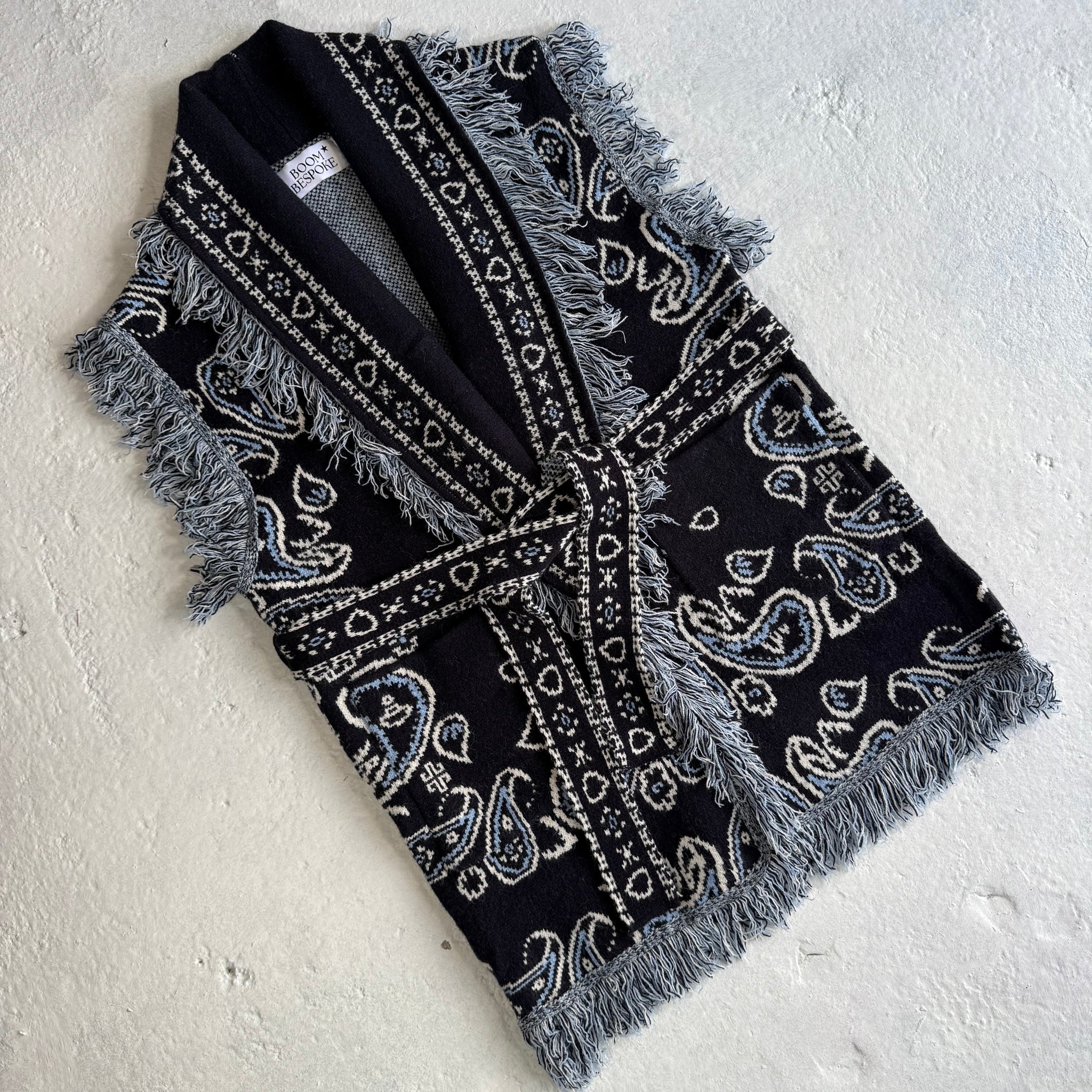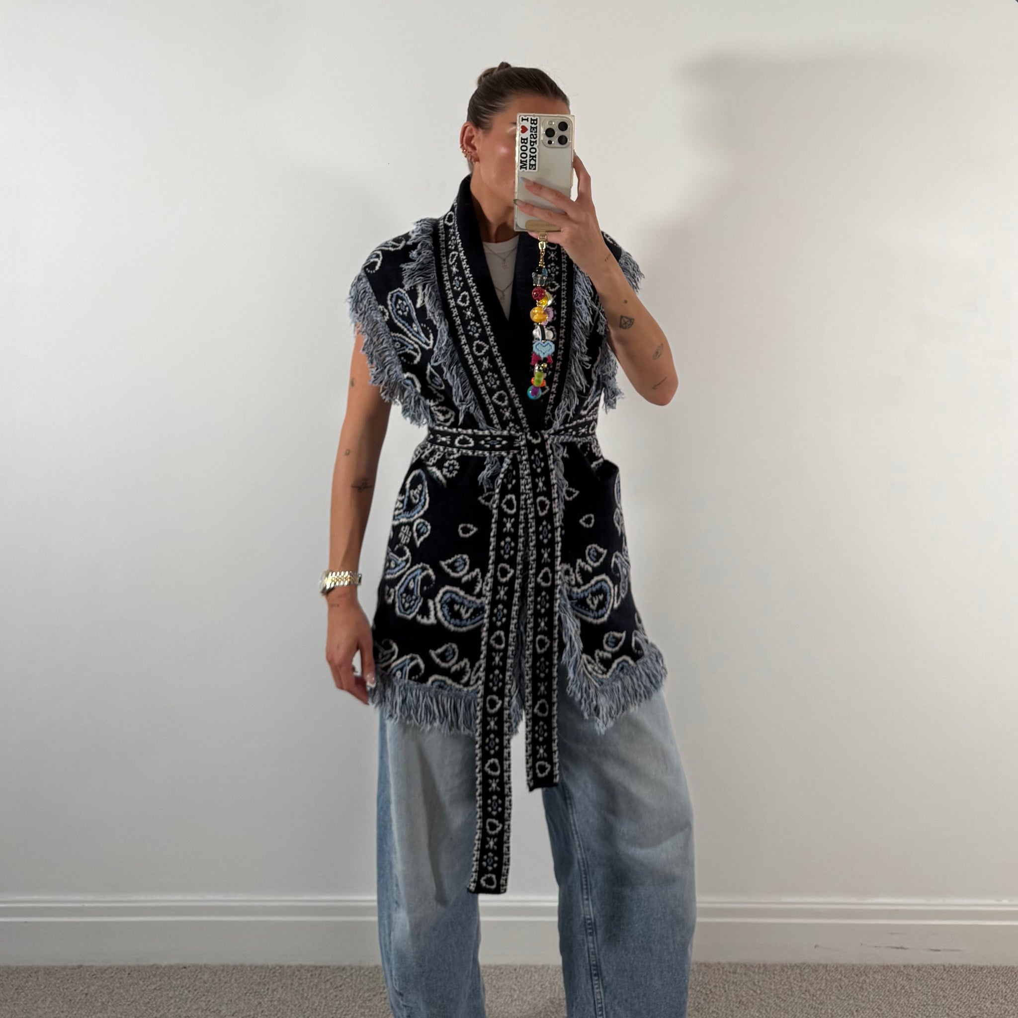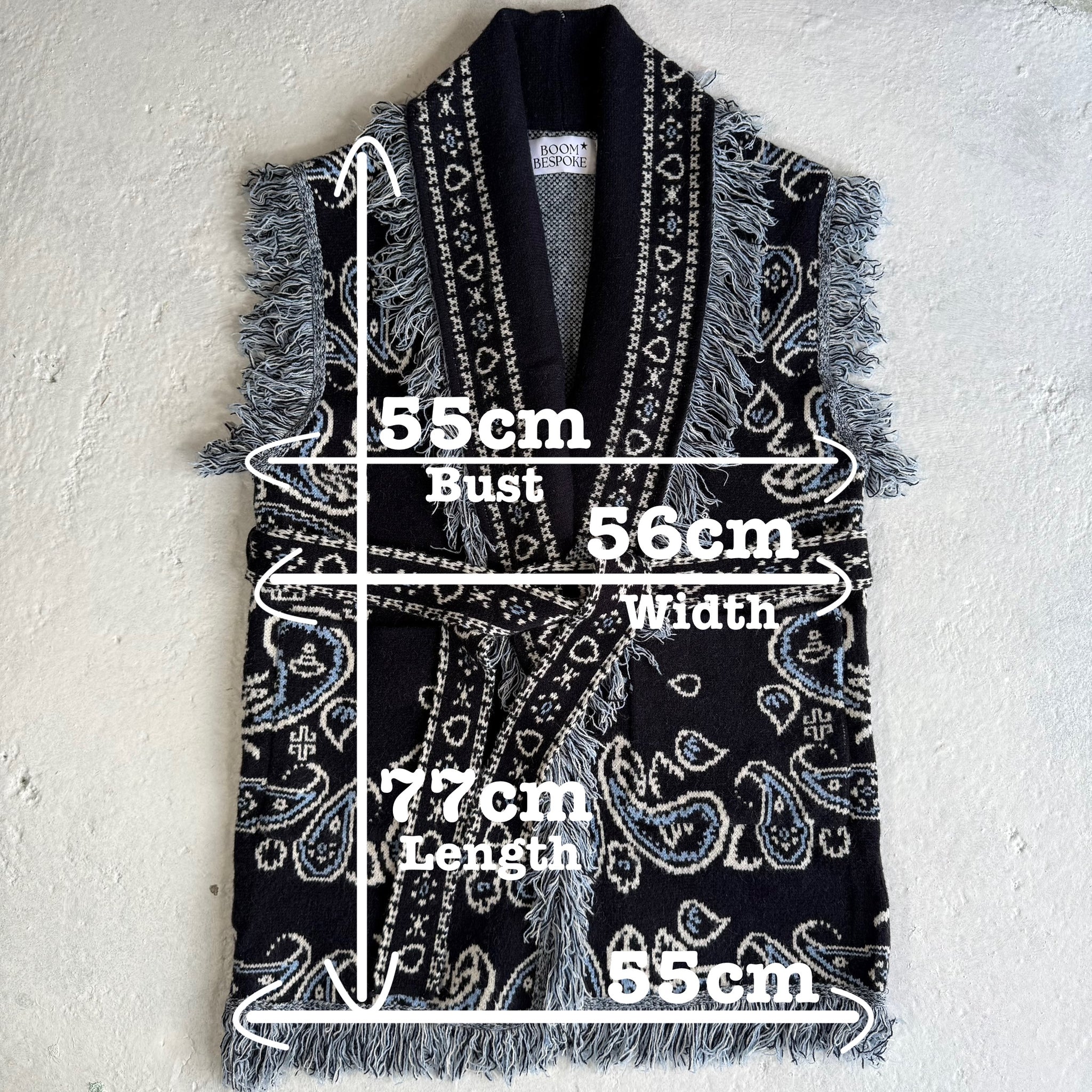 ‘Midnight’ fringed bandana knit belted longline sleeveless cardigan with a navy blue base, off white & pale blue paisley bandana pattern