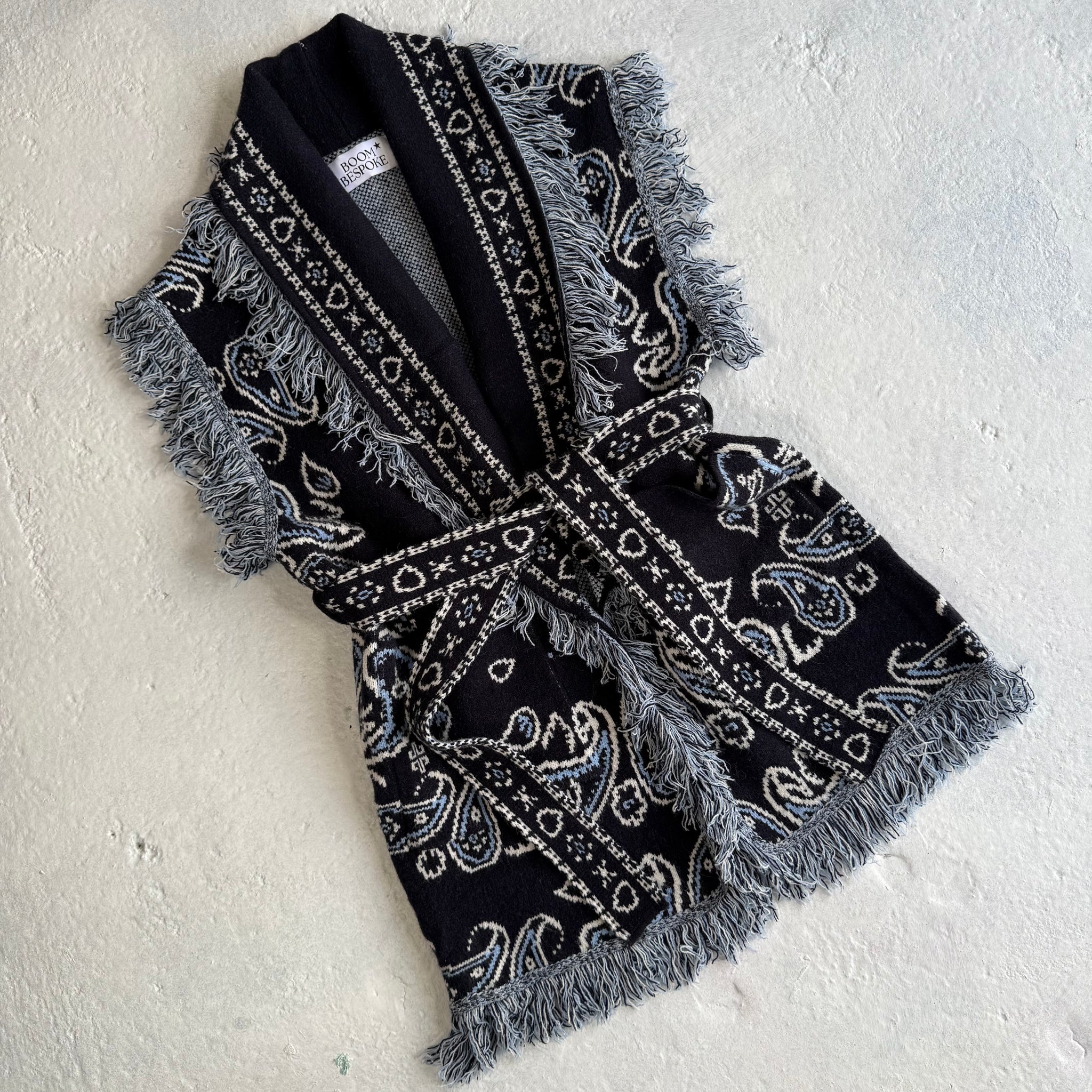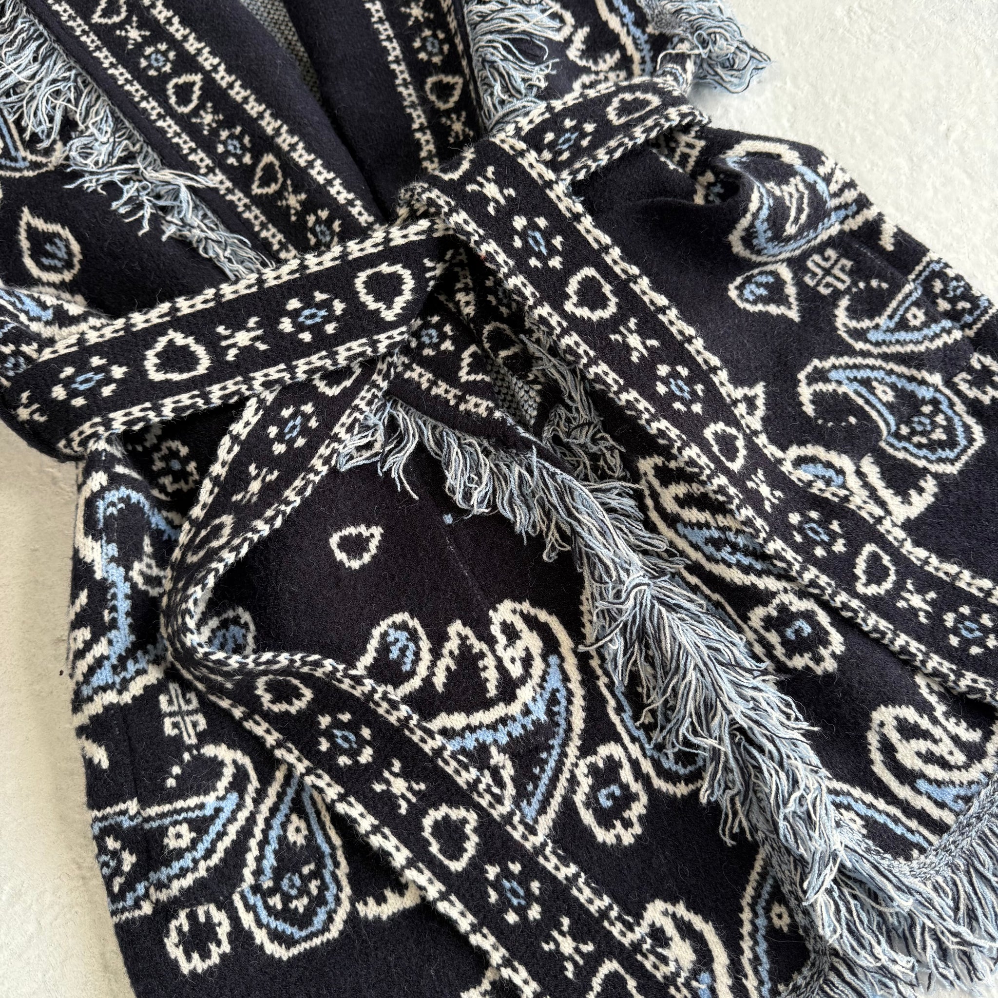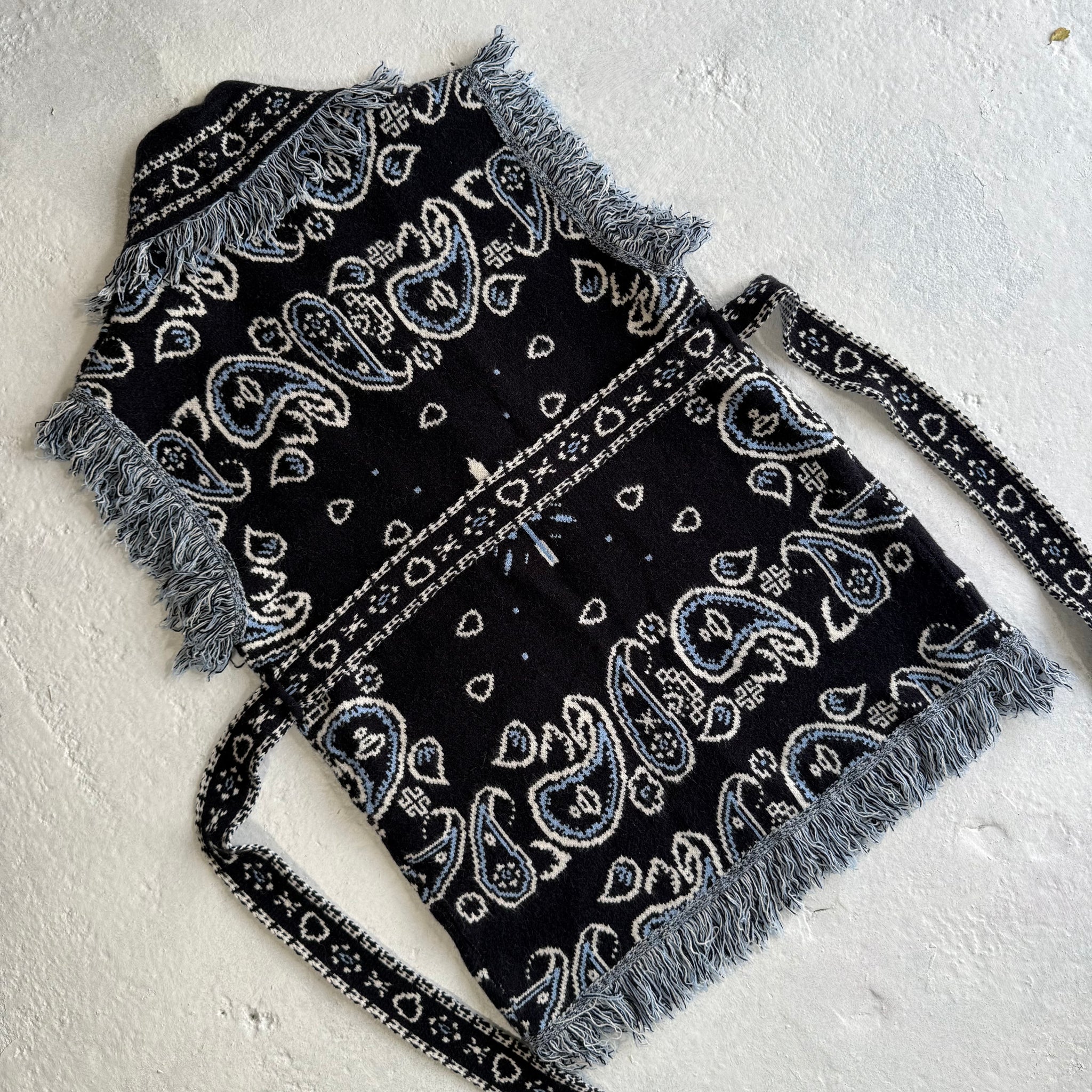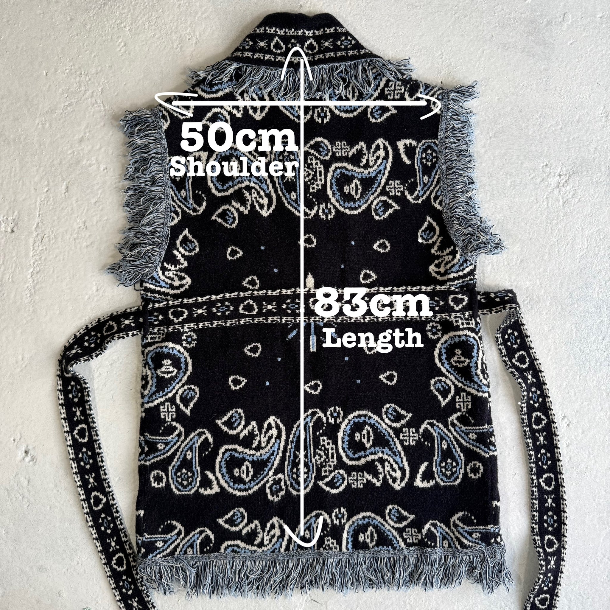 ‘Midnight’ fringed bandana knit belted longline sleeveless cardigan with a navy blue base, off white & pale blue paisley bandana pattern