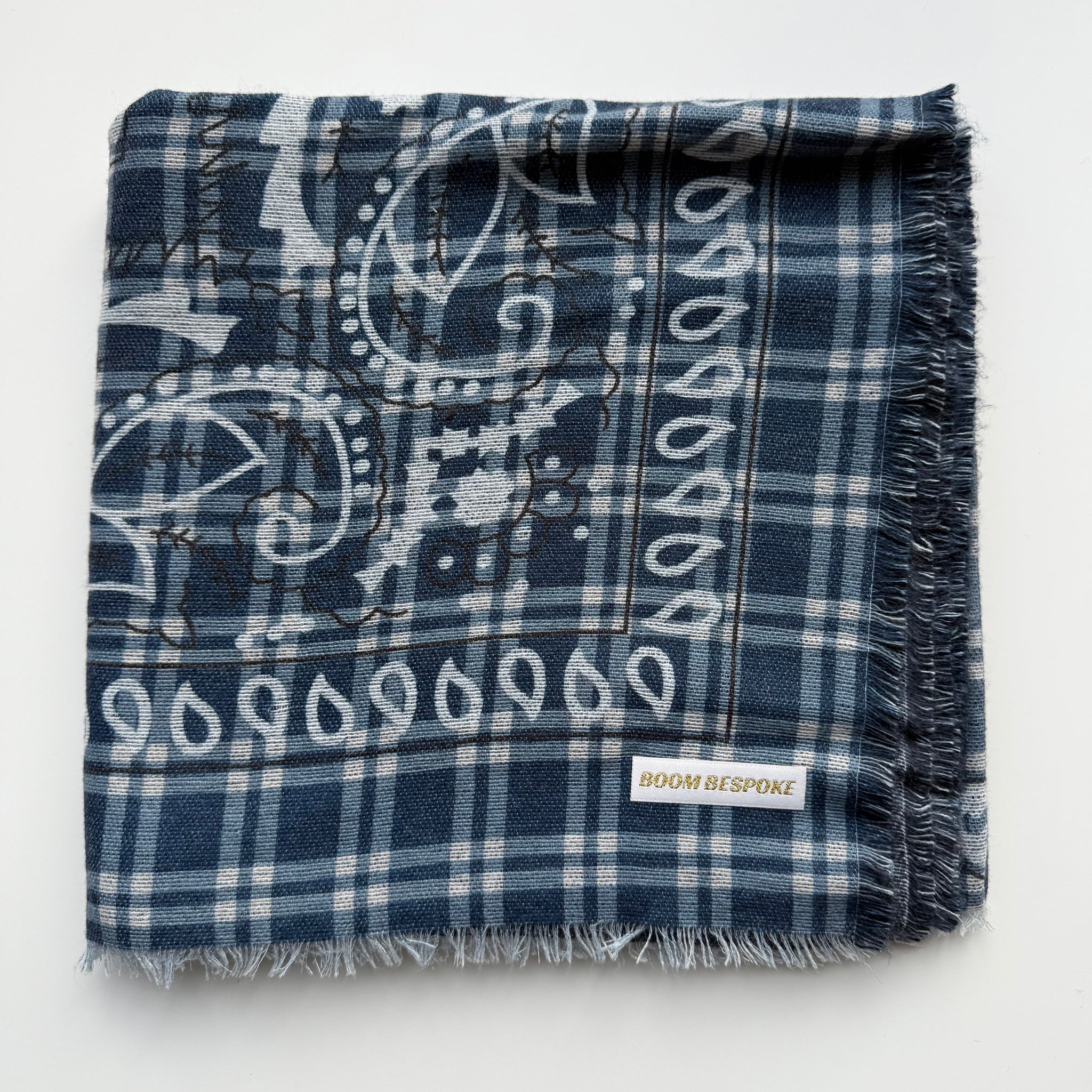 Blue, black & white chequered large bandana paisley print square scarf.