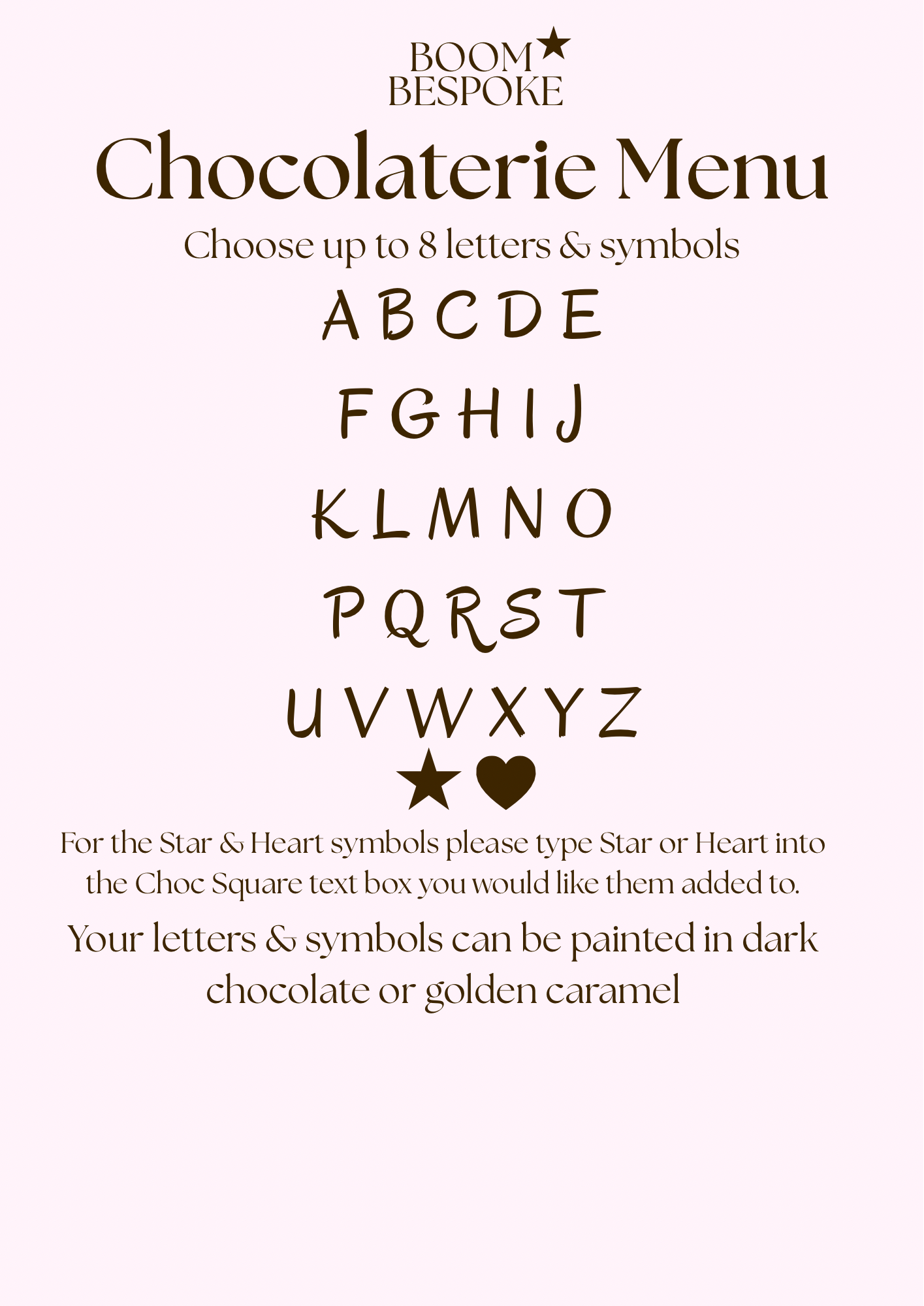Just type your chosen letter or symbol name and the colour you would like into the corresponding Choc Square box.